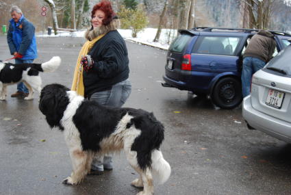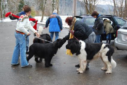 Es waren bereits anwesend als wir um 09.45 Uhr eintrafen: Ben mit Urs, Verena und Desirée, die dieses Jahr liebenswürdigerweise die Einladung gemanagt haben und Janka und Barnaby mit Hans und Carmen, die den weiten Weg von Karlsruhe unter die Räder genommen haben. Und die Begrüssung war lautstark und herzlich, Kaja und Floh waren sofort im Spiel integriert. Im warmen „Hüsli“ waren Verena und Carmen mit den Vorbereitungen schon voll beschäftigt, im Cheminée brannte ein wohliges Feuer, es roch nach feinem Kaffe und die frischen Gipfeli hatten magische Anziehungskraft nach der langen Fahrt mit Schneesturm und der eisigen Kälte. Die nächsten waren Boreas mit Mascha und Stefan die das Ziel gefunden hatten, auch er wurde von seinen Eltern und Geschwister schwanzwedelnd begrüsst und in die Spielrunde aufgenommen. Und als letzter zottelte noch Barcley mit Hildi und Hans in die gute Stube. Leider waren die Tiroler eingeschneit und so konnten Baro mit seinen Futterspender nicht kommen, zuerst sah es so aus, als dass das gleiche Schicksal den jüngsten Bruder aus dem Bündnerland ereilt hätte, denn seine Körnligeber mussten sich zuerst aus dem Schnee freischaufeln.
