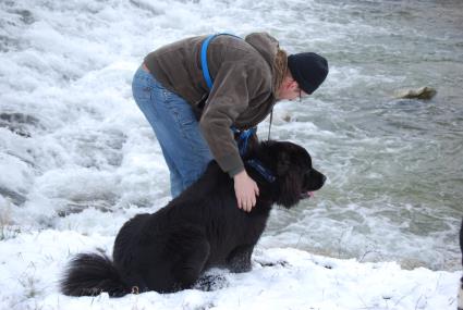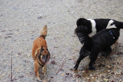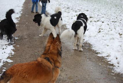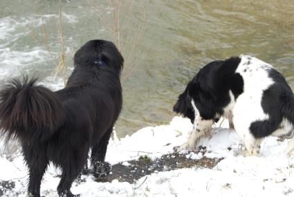 Damit dann doch noch etwas mehr gespielt und Janka in Ruhe den Heimweg geniessen konnte, wurde der Fluss als Trennung benutzt und so zogen wir mit vergnügt spielenden, ganz unschuldigen Hunden auf beiden Seite der Töss wieder zu unseren Autos zurück. Mittlerweile war auch schon der nächste Schneesturm da und wir Zweibeiner froren schon ganz schön.