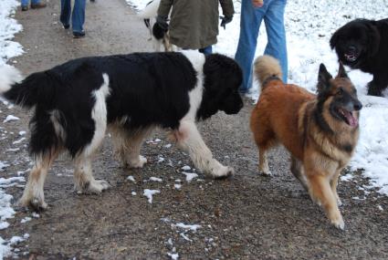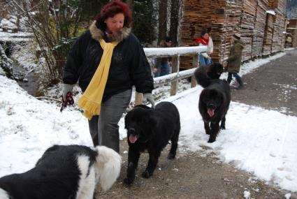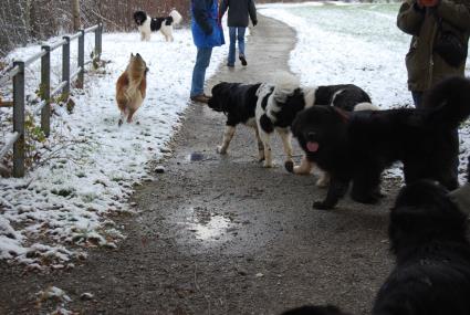 Nach der ersten Stärkung machten wir uns warm eingepackt auf den Weg zu einem längeren Spaziergang entlang der Töss und langsam zeigte sich doch die Sonne begleitet von einer doch ziemlich starken Brise, die nicht zum Verweilen einlud. Doch dies konnte den Hunden nichts anhaben, denn die Söhne von Janka hatten subito erschnüffelt, dass ihre Mutter schon bald wieder läufig sein wird und mussten natürlich so ihre Volljährigkeit der Dame gegenüber beweisen, untereinander wollte jeder der grössere Matcho sein mit seinem Gehabe. Ab und zu musste der Eine oder Andere von seinem Herrchen zu einem unfreiwilligen Bad gezwungen werden, damit er wieder einen kühlen Kopf bekam und sich vermehrt dem Spiel widmete. Zu aller Verwunderung tolerierte der Vater Barnaby das Getue seiner Söhne ohne je einzugreifen, er fand Abwechslung an seiner Tochter Kaja, und Floh interessierte ihn auch nicht wenig.