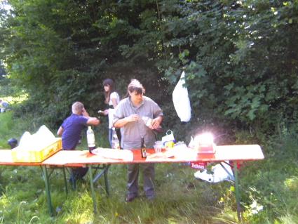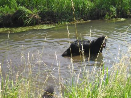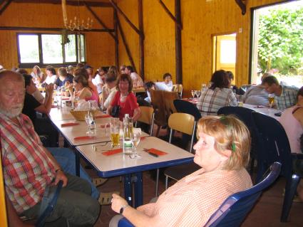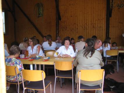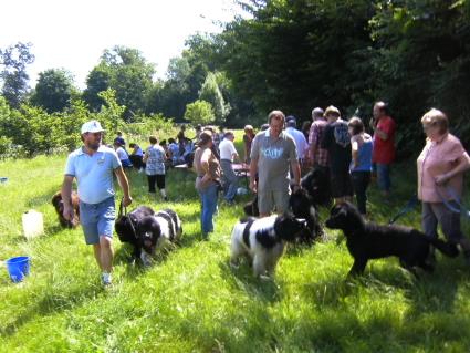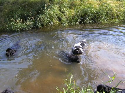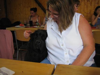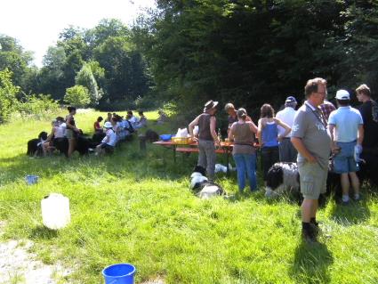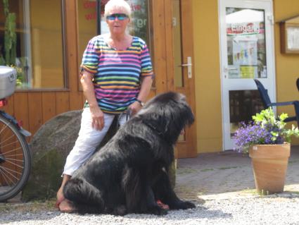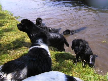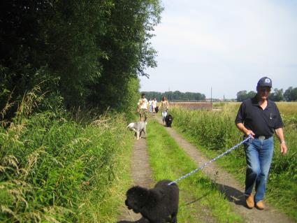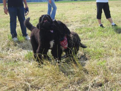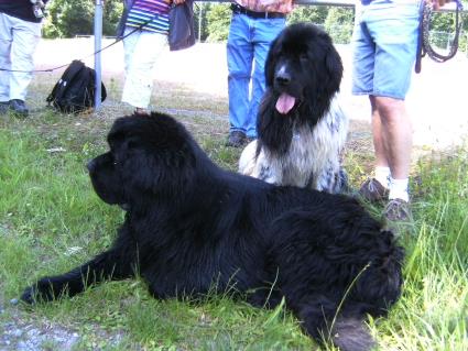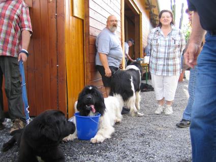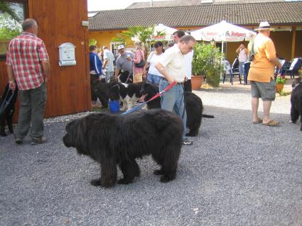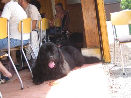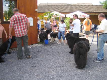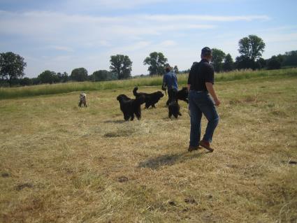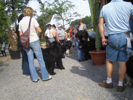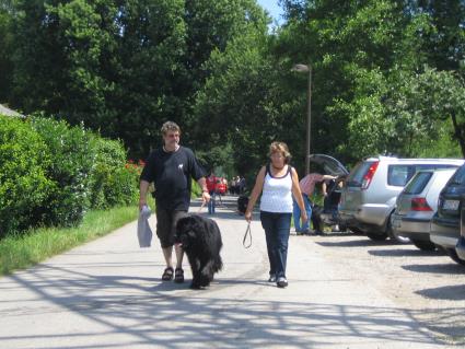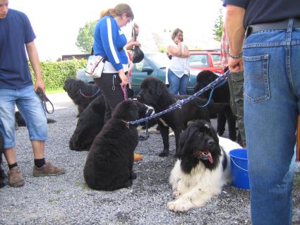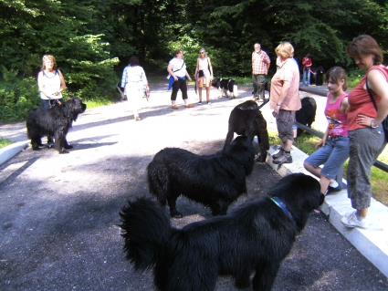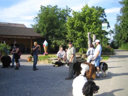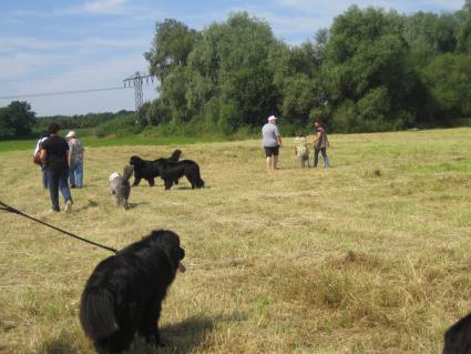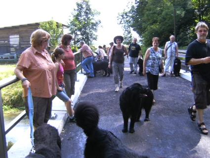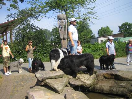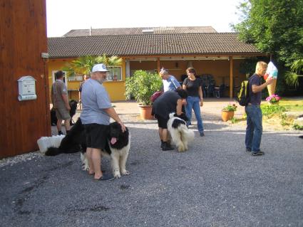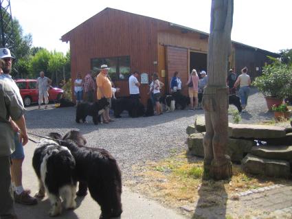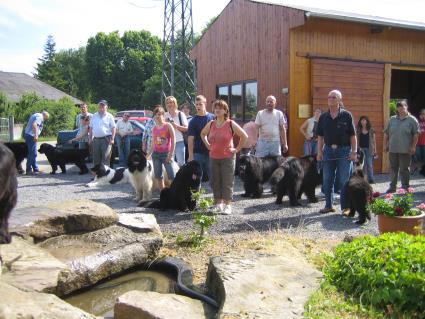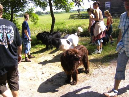 Am 22.06.2008 hatten wir das erste gemeinsame Welpen / Zwingertreffen auf privater Ebene organisiert, mit dem eventuell der Grundstein zu einer Tradition gelegt worden ist. Bei der Terminplanung hatten wir uns natürlich gedacht, Juni... ja, da werden wir wohl Glück haben mit dem Wetter. Aber, dass es der heißeste Tag in diesem Jahr wird, damit hatten wir nicht gerechnet. Dennoch trafen bei nicht neufigerechten Temperaturen pünktlich die 61 zwei- und 39 vierbeinigen Gäste ein und die Freude war sehr groß, Tier und Mensch wiederzusehen oder neu kennenzulernen. Auch die Familien-Zusammenführungen fanden statt, als Geschwister sich wieder trafen oder Mütter ihre Welpen wiedersahen. Nach einem kleinen Frühstück fand die Wanderung, dem bekannten gutmütigen Charakter der Neufundländerhunde entsprechend, in geradezu erstaunlicher Ruhe und Eintracht statt. Wie geplant kamen wir nach 2,5 Stunden vom Spaziergang zurück,(die kleine Runde mit den Junghunden und Welpen war erheblich kürzer) wo sich die Zweibeiner mit Getränken und Speisen stärken und die Vierbeiner sich nach viel Spiel und Spass ausruhen konnten. Hier ein herzliches Dankeschön an das Team von Manuela Kaiser für die Getränke der Zwei- und Vierbeiner beim Zwischenstopp. Wer wollte, konnte noch an der Führung durch die Straußenfarm, an der auch unsere Neufis willkommen waren, teilnehmen. Wir verbrachten einen wunderschönen Tag an dem es viel zu erzählen und zu “hundeln”gab .